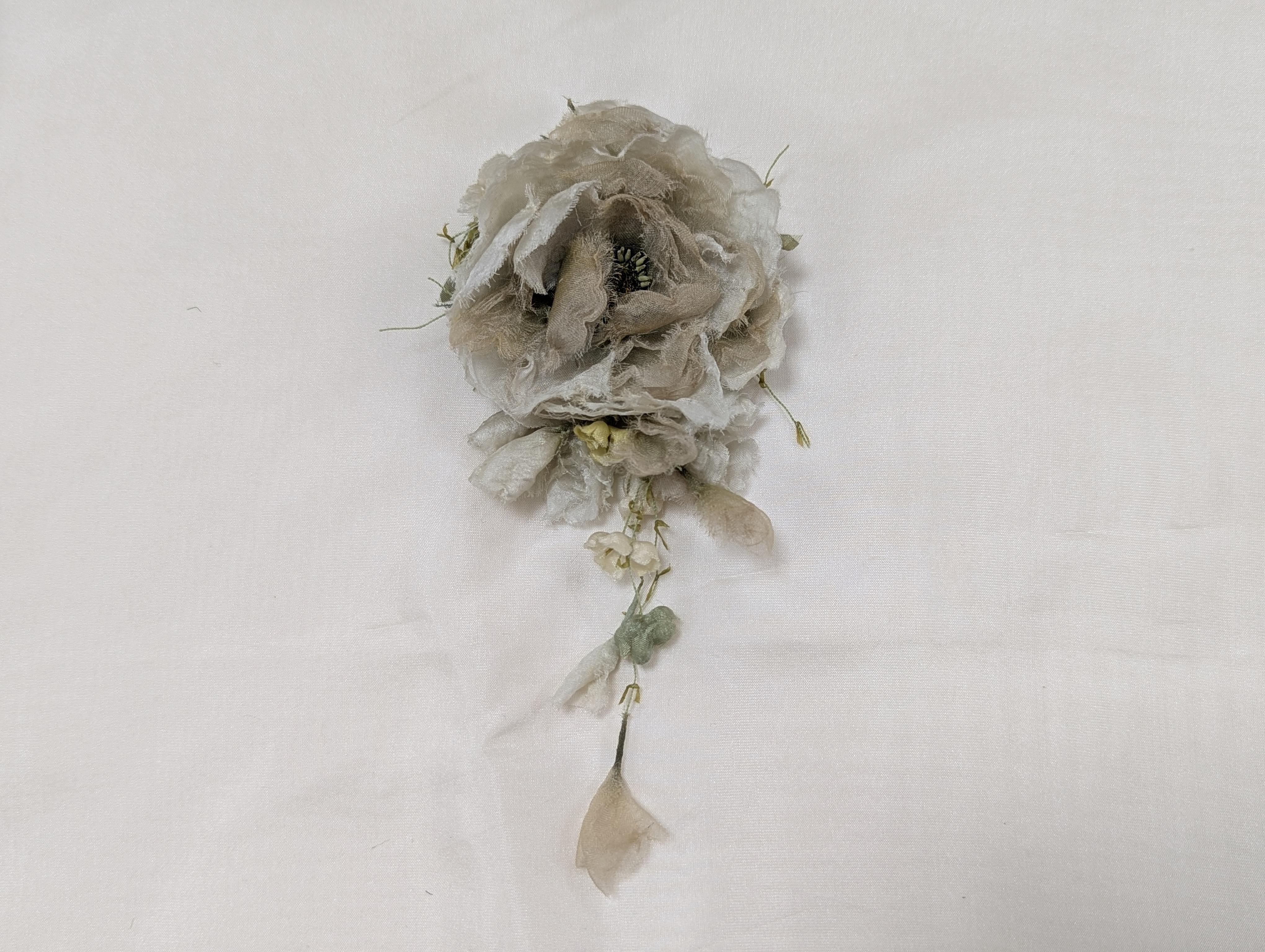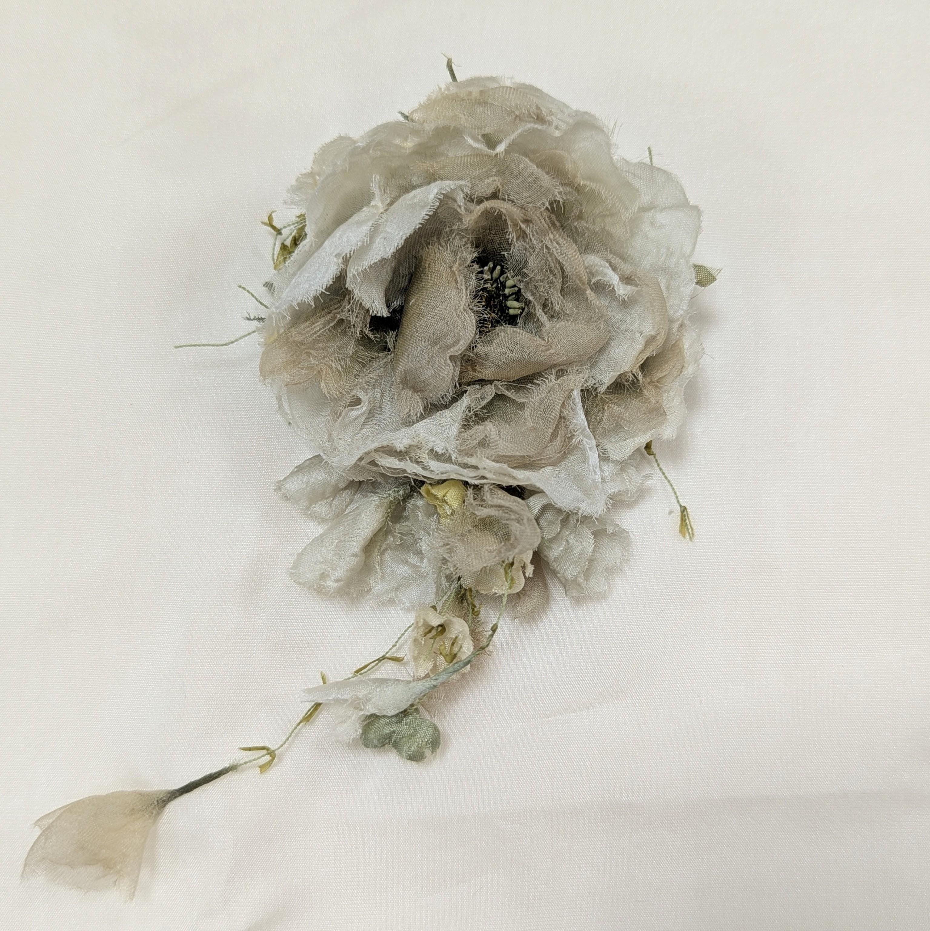 花びらをちりちりとさせたその花びらを重ねながら、開きバラの表情をイメージして作りました。たらたらと花びらを下に垂らしおしゃれなデザインに。ふわふわ・・・とても軽いコサージュです。